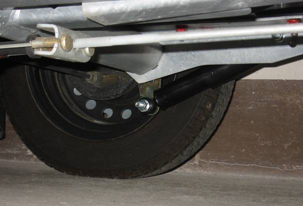 Die Sache scheint recht einfach, es empfiehlt sich, die Räder hierfür abzunehmen. Halterungslasche für den Stoßdämpfer an die dafür vorgesehene Stelle an der Achse anschrauben, Stoßdämpfer dran fertig! Die Bilder sind selbsterklärend, ich habe es zugegebenermaßen nicht selber gemacht, weil der nette Hymermann noch Zeit hatte und mir einen Gefallen tun wollte (dafür bin ich ihm sehr dankbar!). Die Sache scheint jedoch für jeden, der einen Schraubenschlüssel halten kann (und das sind die Touringleute doch in der Regel) in einer Stunde zu erledigen. Sollten noch Fragen offen sein, stehe ich gerne zur Verfügung. Viel Spaß beim Nachbasteln und immer zwei Handbreit stockfleckenfreien Stoff unterm Hubdach wünscht Euer