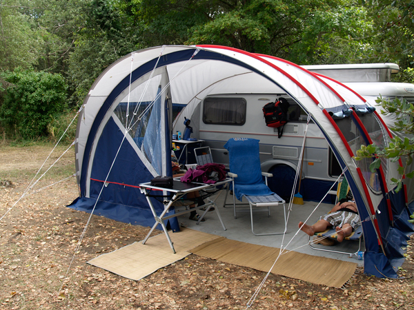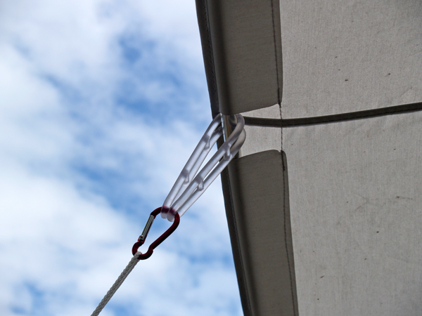 Ich habe einige Zeit überlegt, wie ich die Abspannleinen beim neuen Touring-Tunnelzelt besser, leichter und vor allem schneller anbringen könnte und bin auf die in den drei angehängten Fotos dokumentierten Idee gekommen. Bisher musste jede Abspannleine beim Aufbau angebunden und für den Abbau wieder abgebunden und entfernt werden, weil sonst die Stangen nicht rausgeschoben werden konnten. Jetzt habe ich drei fertige komplette Abspanner die ich einfach mit Karabinerhaken und "Abspannleitern" anhake.